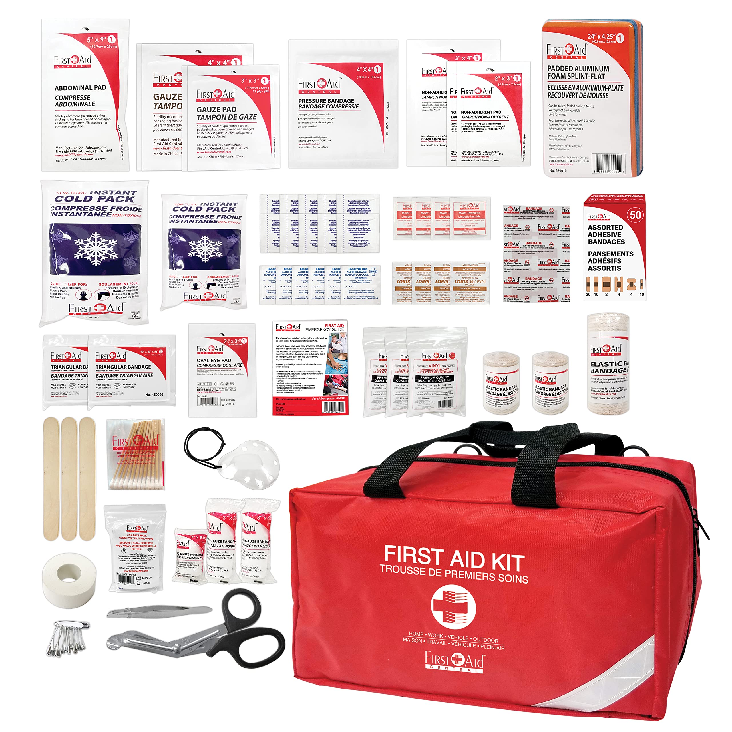- Includes trauma bandages, splint, CPR mask